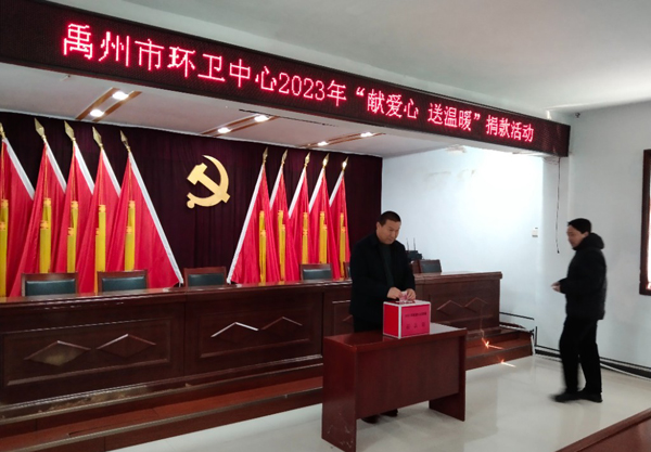 为积极响应市委、市政府《关于开展2023年年度“献爱心 送温暖”捐赠活动》的号召,切实保障城乡困难群众温暖过冬。1月12日,市环卫中心在机关南二楼会议室举办2023年度“献爱心 送温暖”爱心捐款活动。